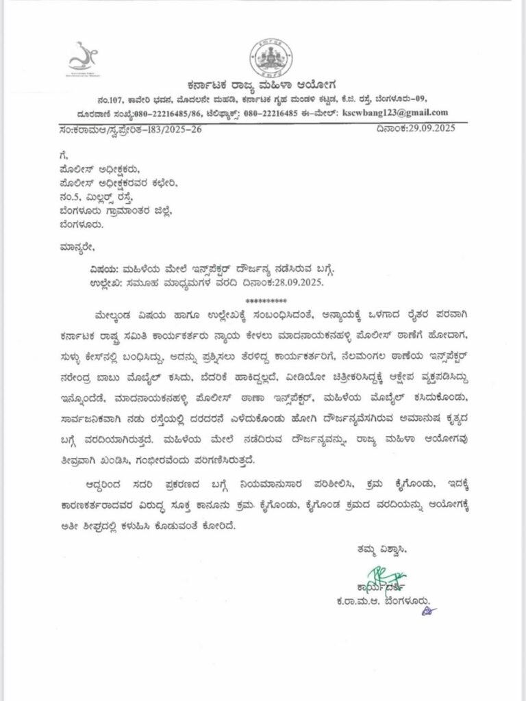 ರೈತರಿಗೆ ಆದ ಅನ್ಯಾಯ, ಮೋಸದ ಪರವಾಗಿ ಕೆಆರ್ಎಸ್ ಪಕ್ಷವು ಮಾದನಾಯಕನಹಳ್ಳಿ ಪೊಲೀಸ್ಠಾಣೆಗೆ ಕೆ ಆರ್ ಎಸ್ ಪಕ್ಷದ ಕಾರ್ಯಕರ್ತರು ಹೋದಾಗ ಪೊಲೀಸರು ನಡೆದುಕೊಂಡ ರೀತಿ ಮತ್ತು ಮೊಬೈಲ್ ಕಸಿದುಕೊಳ್ಳುವುದು, ಬೆದರಿಕೆ ಹಾಕಿ ವಿಡಿಯೋ ಚಿತ್ರೀಕರಿಸಿದ್ದಕ್ಕೆ ಅಕ್ಷೇಪಾ ವ್ಯಕ್ತಪಡಿಸಿದ್ದಕ್ಕೆ ಮತ್ತು ಕೆ ಆರ್ಎಸ್ ಪಕ್ಷದವರ ಮೇಲೆ ಹಲ್ಲೆ ಮಾಡಿದ ವಿಚಾರದಲ್ಲಿ ತನಿಖೆ ಮಾಡಿ ವಿವರ ಸಲ್ಲಿಸುವಂತೆ ಮತ್ತು ಮಾದನಾಯಕನಹಳ್ಳಿ ಇನ್ಸ್ಪೆಕ್ಟರ್ ಮುರಳಿಧರ್ ಮಹಿಳೆಯನ್ನು ನಾಯಿಯಂತೆ ದರದರನೆ ರಸ್ತೆಯಲ್ಲಿ ಏಳಿದುಕೊಂಡು ಹೋಗಿರುವುದಕ್ಕೆ ತನಿಖೆ ನಡೆಸಿ ವರದಿ ನೀಡಲು ಕರ್ನಾಟಕ ರಾಜ್ಯ ಮಹಿಳಾ ಆಯೋಗ ಬೆಂಗಳೂರು ಗ್ರಾಮಾಂತರ ಪೊಲೀಸ್ ಅಧೀಕ್ಷಕರಿಗೆ ಪತ್ರ ಬರೆದಿದೆ….